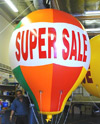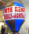 The classic shape of these giant balloons resonates with people the world over and reminds us of the romantic adventures of Jules Verne's "Around the World in 80 Days." The graceful balloon is visible for miles around, achieving your advertising objective in a passive, non-intrusive way. Why pay thousands for short-term print media or billboard advertising when a one-time purchase can deliver great results over and over again? Fly one of these colorful balloons above your tradeshow booth and make it clear to all attendees who you are and where your booth is located. Advertise a special event or just catch the eye of potential customers as they whiz by in their cars. A portable and reusable display than can be ready to fly in minutes. The giant helium hot-air balloons are available in 8' and 12' sizes. The PVC material is manufactured with a UV inhibitor that will protect it from fading. Color is not applied as a coating, but formulated into the material, so the color will never peel or crack. Artwork is digitally applied using a flexible urethane based paint that will not peel or wrinkle. At 18 mil thick, the material is stronger and more durable than most standard inflatable displays. See pricing below. Multi-colored stripes and Stars & Stripes design in Red, White and Blue are available, as well as seven solid colors to choose from. Order a simple one or two color logo imprint or let our designers create a custom look with a digitally applied logo or message. See pricing below. Ideal for indoor use, these giant balloons are also suitable for limited outdoor use, depending on local conditions and wind gusts. These